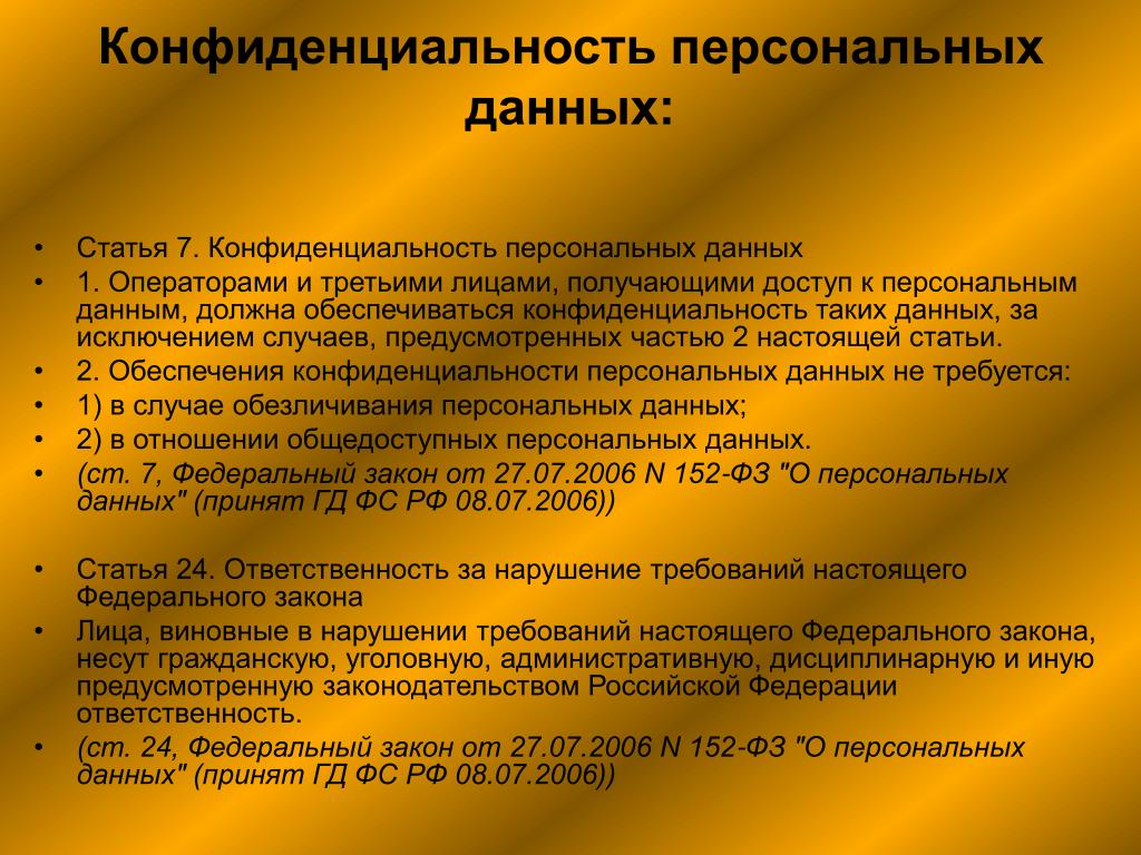 Операторы и иные лица, получившие доступ к персональным данным, обязаны не раскрывать третьим лицам и не распространять персональные данные без согласия субъекта персональных данных, если иное не предусмотрено федеральным законом (ст.