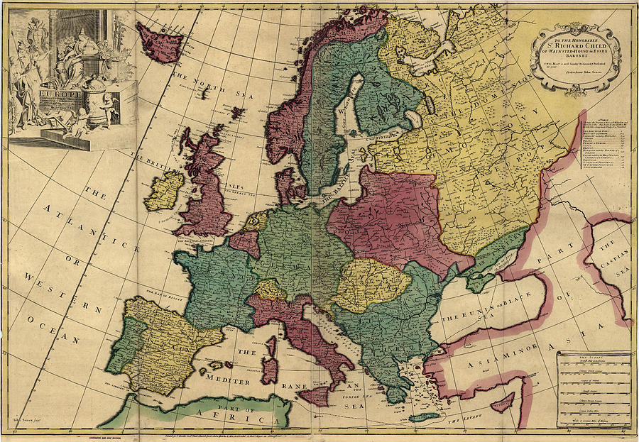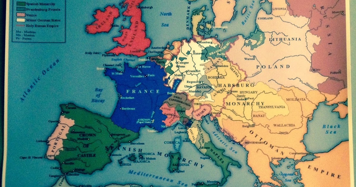На карте мира 1700 года — Российская Империя стала ещё больше вместе с Сибирью, в Центральной и Южной Америке — желтая территория Испании, территория Бразилии принадлежит Португалии (красный). В Северной Америке красным цветом показаны территории Англии, светло-зелёный — Канада.