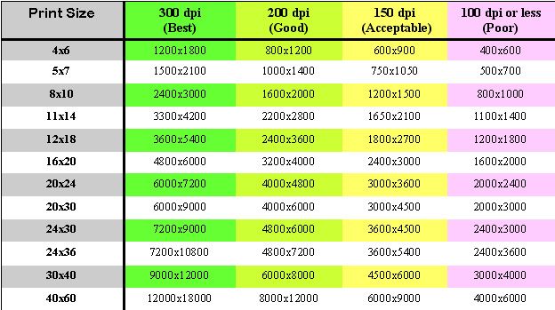 | 4 x 6 дюймов | 1200 x 1800 пикселей | 1000 x 1500 пикселей | 800 x 1200 пикселей |