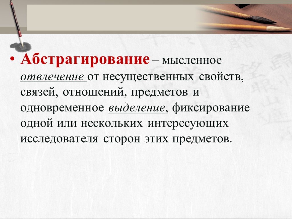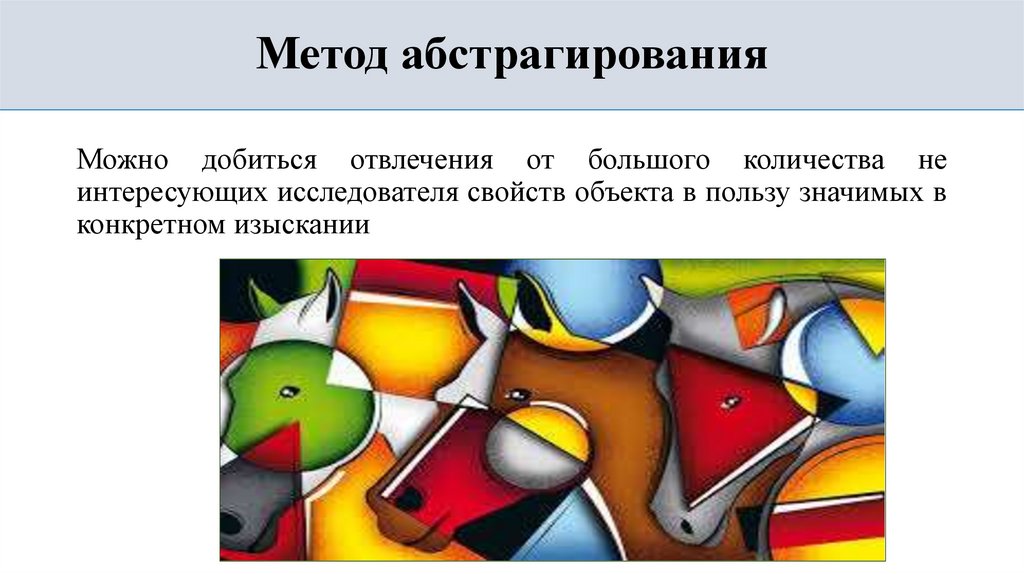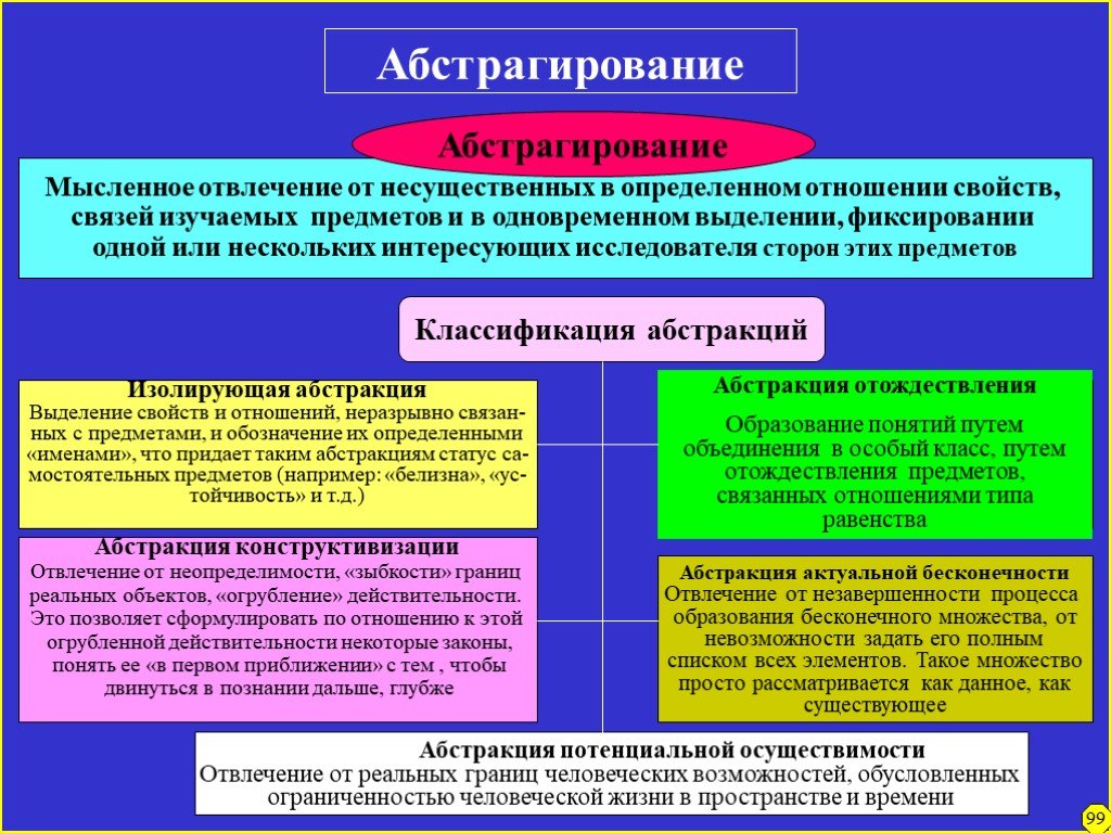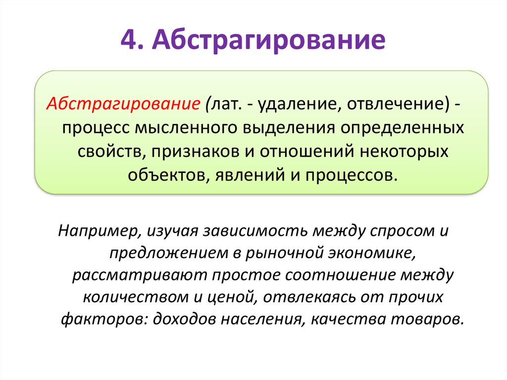 • изолирующая абстракция — вычленение исследуемого явления из некоторой целостности, отвлечение от не интересующих вариантов.