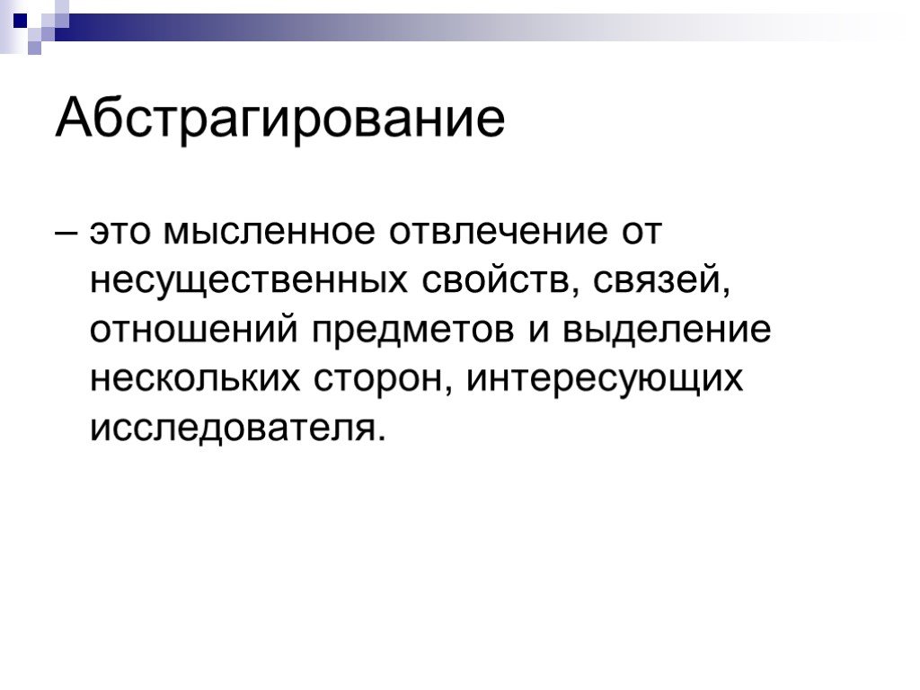 Абстрагирование — это форма познания, представляющая собой мысленное выделение существенных свойств и связей предмета и отвлечение от других его свойств и связей, признаваемых «частными», несущественными. Это теоретическое обобщение позволяет отразить основные закономерности исследуемых объектов или явлений, изучать их, а так же прогнозировать новые, неизвестные закономерности. В качестве абстрактных объектов выступают целостные образования, составляющие непосредственное содержание человеческого мышления — понятия, суждения, умозаключения, законы, математические структуры и др.
