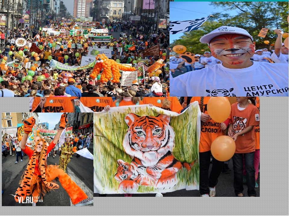 Кульминацией Дня тигра по традиции станет костюмированное шествие по улицам Владивостока 27 сентября. По Океанскому проспекту до центральной площади пройдут представители коренных малочисленных народов в национальных костюмах, дети и взрослые, одетые в яркие оранжево-черные костюмы тигров, с плакатами и слоганами, призывающими защитить уникальную дальневосточную природу.