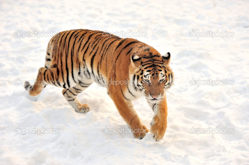 Амурский тигр охотится, обходя свою территорию. Он видит жертву, подползает ближе к ней, выгибает спину и дает упор задними лапами в землю.