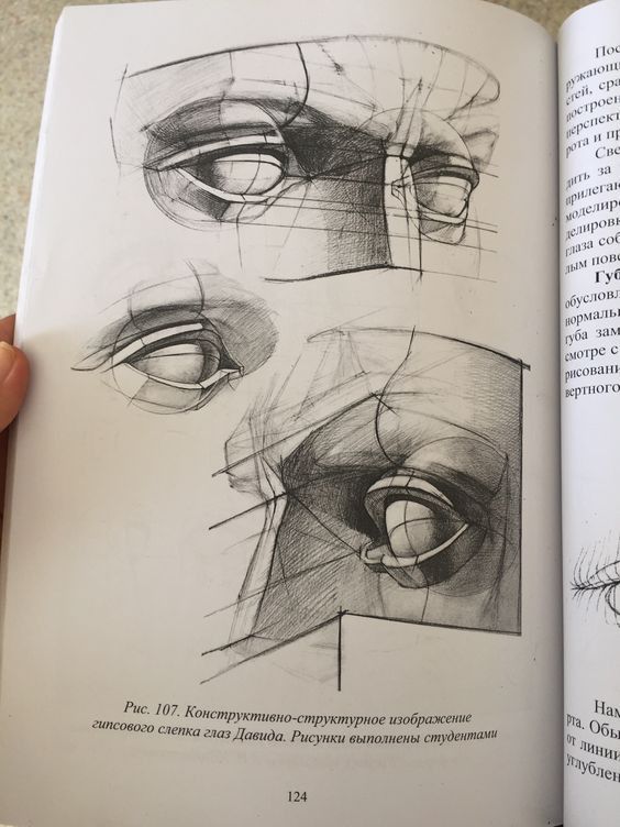 Глазное яблоко имеет форму шара, который крепится внутри глазницы. Мы видим только часть этого шара, прикрытого веками. Рисуя глаз в любой технике, нужно помнить и понимать что свет и тень мы показываем на шаровидной форме.