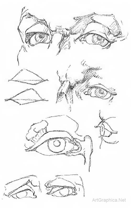 Некоторые базовые знания анатомии одинаковы для художников, врачей и ученых. Прежде всего необходимо понять, что глаз состоит из глазного яблока и вспомогательного аппарата глаза. К вспомогательному аппарату глаза относятся веки, слезный аппарат, надбровные дуги и глазные мышцы.