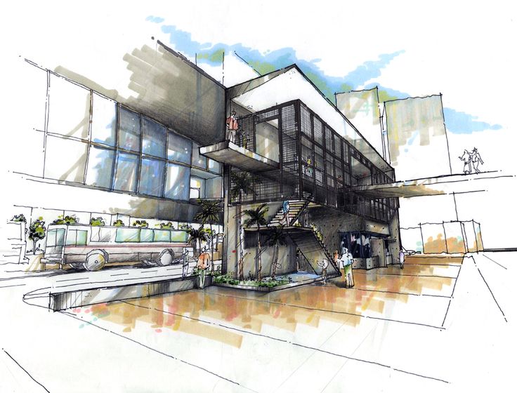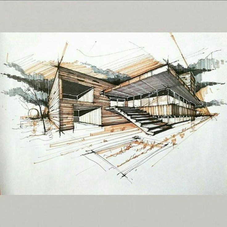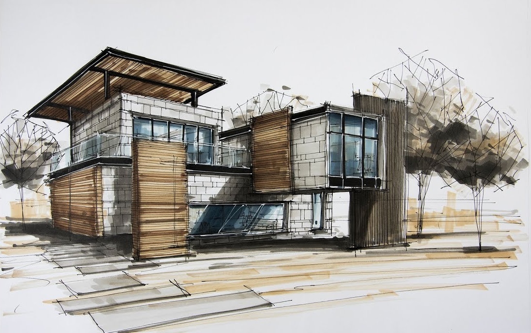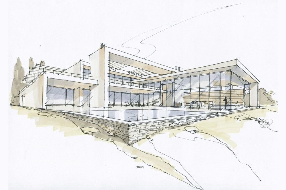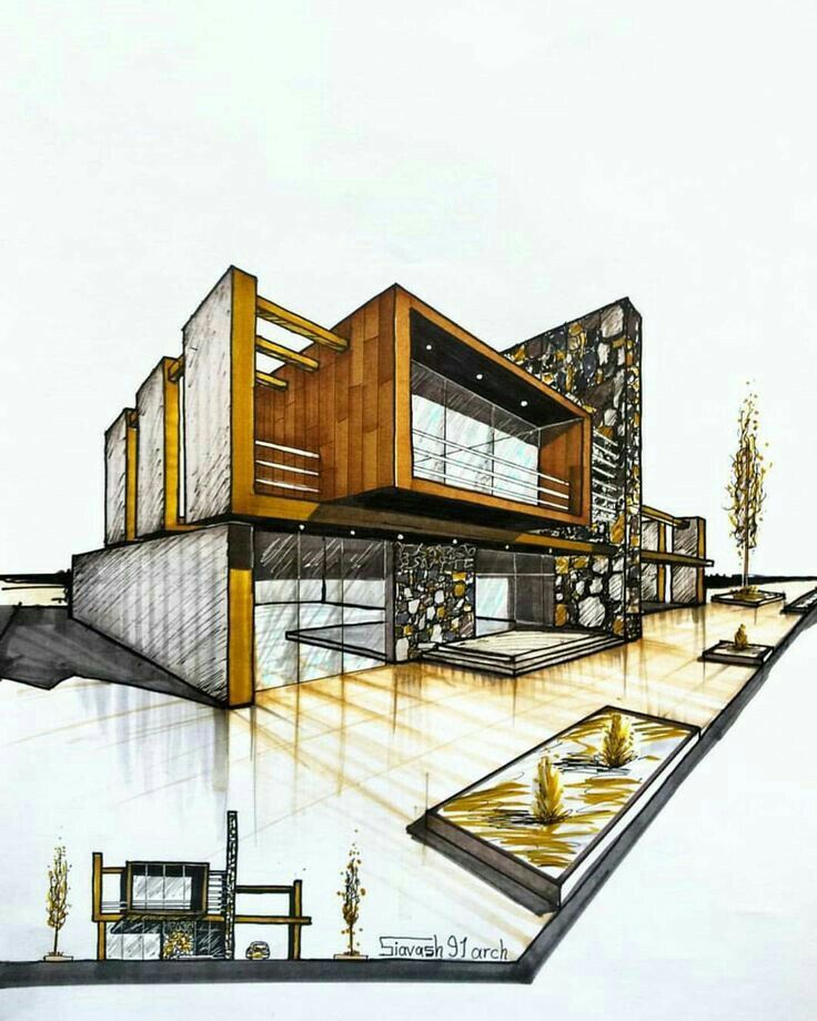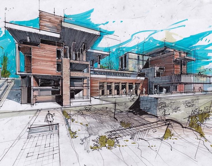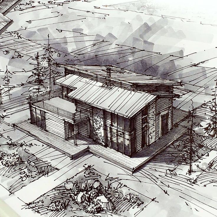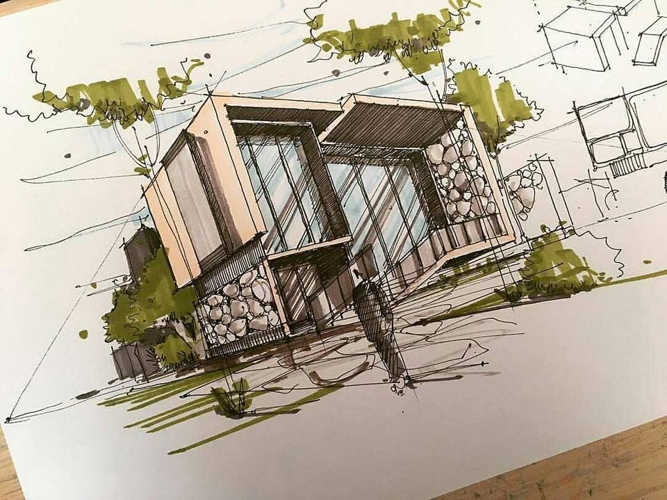 Архитектурный скетч от Кристины Куликовой. ИсточникЛандшафтный. Иногда это раскрашенная и дополненная карта земельного участка, а в ряде случаев и полноценное изображение ландшафта с загородным домом, кустами на лужайке и бассейном. Рисовать такой скетч проще, чем создавать модель для согласования с клиентом на ПК.