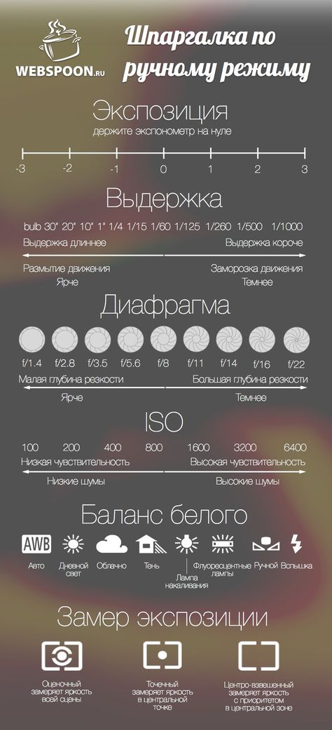 Использование ручного режима не всегда основано на догадках – измерительный прибор, встроенный в камеру, помогает вам принять решение, указывая, считает ли камера, что изображение было перевыдержано или недодержано. Измерение, обычно, основано на среднем количестве серого цвета, поэтому наличие светлых или тёмных объектов на фото может оказать влияние на измерение экспозиции. Режим измерения экспозиции показывает как прибор воспринимает свет. Матричный замер означает, что камера воспринимает свет от всей сцены. Центрально-взвешенный интегральный замер учитывает только то, что находится в центре кадра. Точечный замер определяет свет от тех точек, на которых вы сфокусировались.