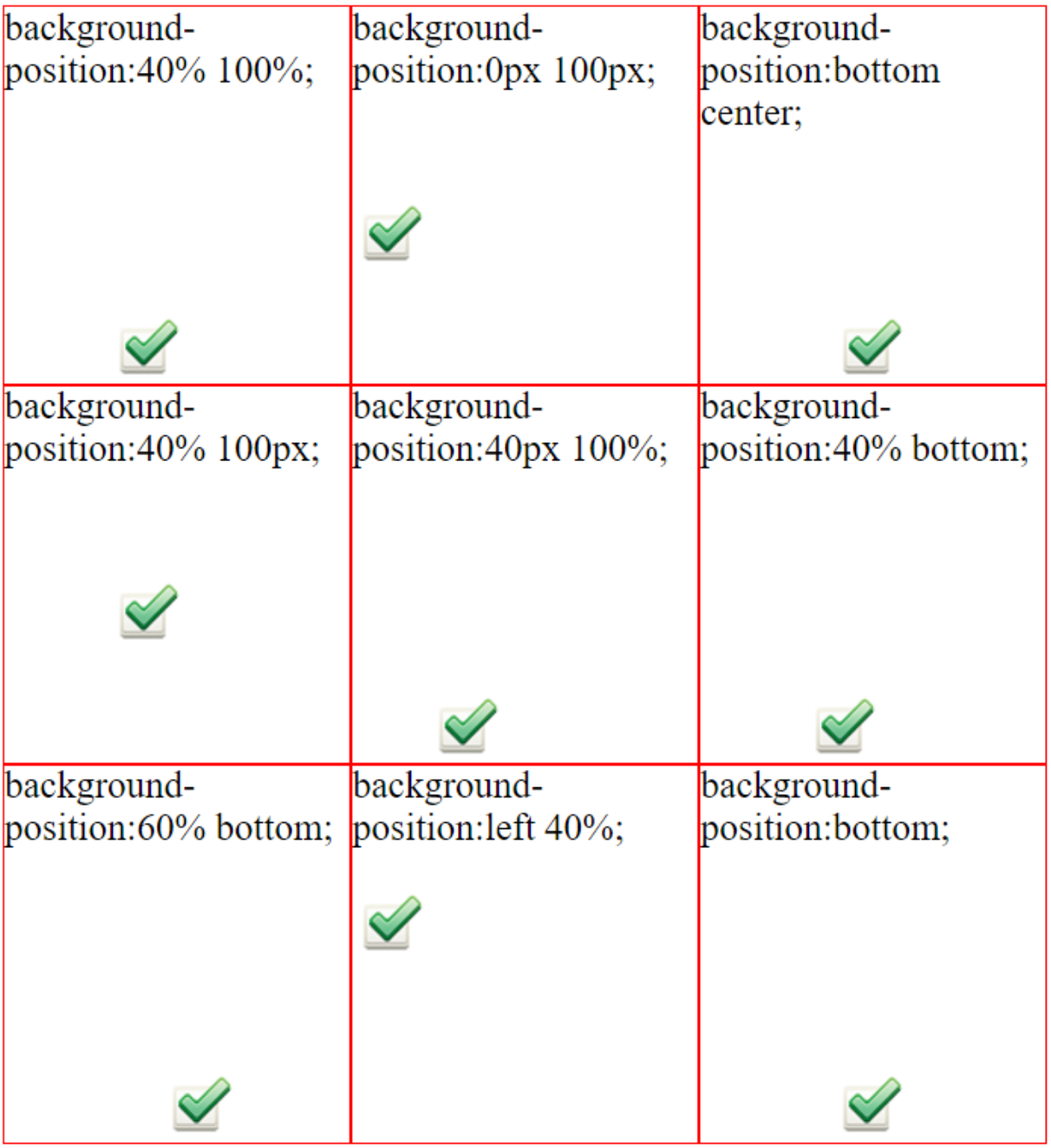 <відсотки><відсотки>— перше значення визначає позицію по горизонталі, друге — по вертикалі. Наприклад, 0% 0% — верхній лівий кут. 100% 100% — правий нижній.<відсотки>— горизонтальна позиція картинки у відсотках від 0% до 100%. Вертикальне значення буде рівним 50% (= посередині).<розмір><розмір>— вказує місце розташування (перше значення — по горизонталі і друге — по вертикалі, відповідно) з використанням прийнятих в CSS розмірних величин.<розмір>— горизонтальне положення тла, вказане одним з прийнятих в CSS розмірних величин. Вертикальне значення буде рівним 50% (посередині).- left top — верхній лівий кут — те ж саме, що 0% 0% або top left.