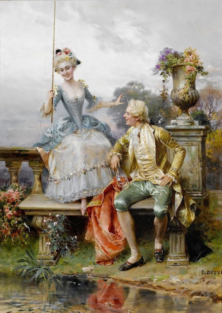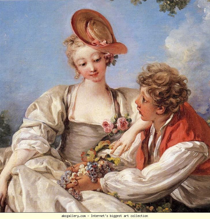 - Характерны сцены ухаживания, романтики, веселья, игривости и сексуальные символы. Все, изображенное на полотне, воплощает красоту и беззаботность.