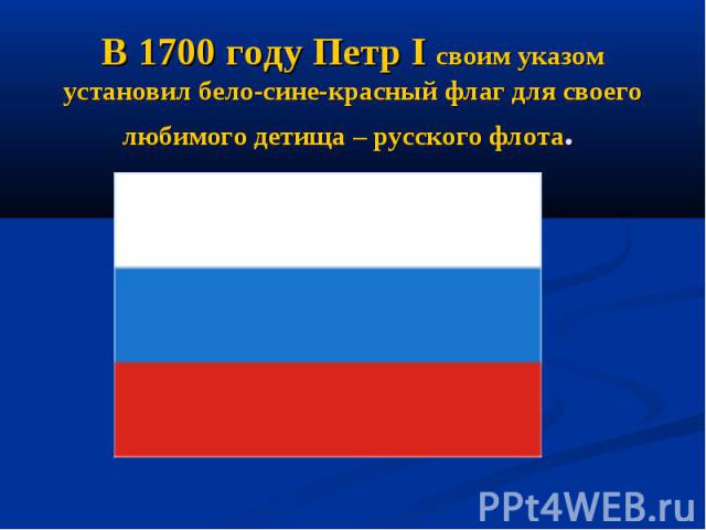 «Самым концом XVII века датируется собственноручный рисунок Петра I с изображением трёхполосного бело-сине-красного флага, но без двуглавого орла. Он был установлен для гражданских и торговых судов.