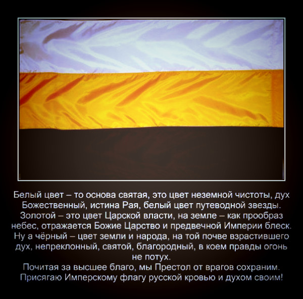 Так вот до 1858 года флаг был иной. Порядок цветов в нем был таков: начиная с верхней полосы – белой, далее желтой и черной внизу. В таком виде он существовал до момента его официального принятия. Наряду с ним существовал бело-синекрасный… Но бело-желто-черный до Александра II, а после черно-желто-белый флаг обществом воспринимался как Имперский, правительственный, в отличие от бело-сине-красного флага торгового флота России. С Имперским флагом в сознании народа связывались представления о величии и могуществе государства. Это и понятно, что может быть величественного в торговом флаге, в самих его цветах, которые были искусственно привязаны к Русской культуре Петром I? Конечно, нельзя отрицать всех заслуг Великого императора, но здесь он явно перегнул палку (простонапросто скопировал цвета флага Голландии).