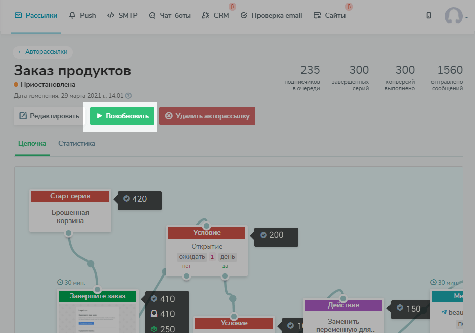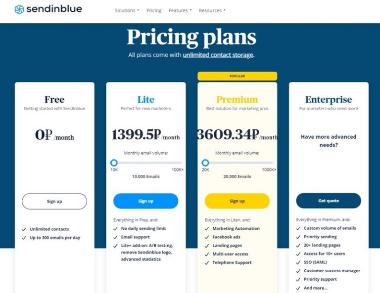 Бесплатный план имеет ограничения: до 2000 контактов и до 10 000 отправленных писем, также всего несколько шаблонов письма, самый простой сценарий автоматизации, 7 маркетинговых каналов, CRM.