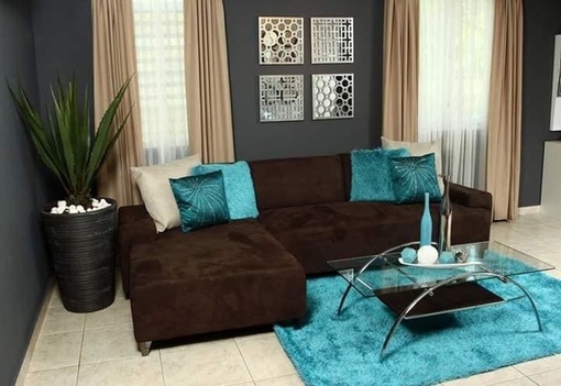 Бирюза и шоколад в интерьере гостиной