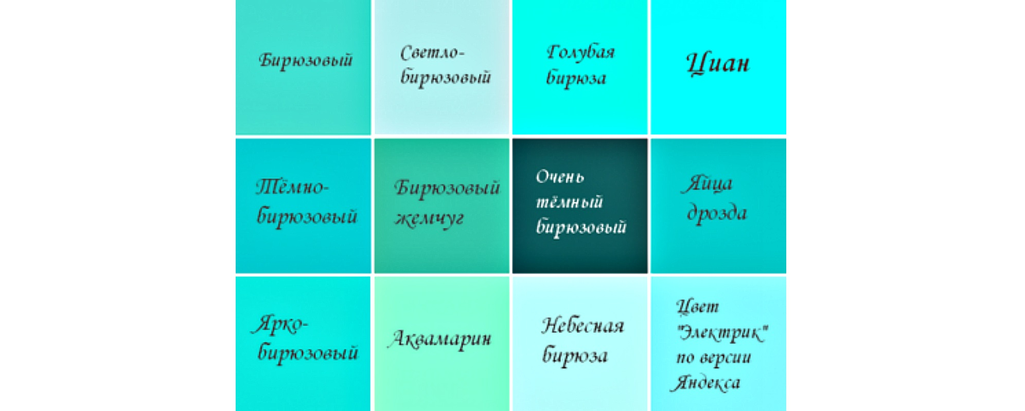 Примеры цветов, которые часто вызывают путаницу, включают цвет морской волны, аквамарин, бирюзу,