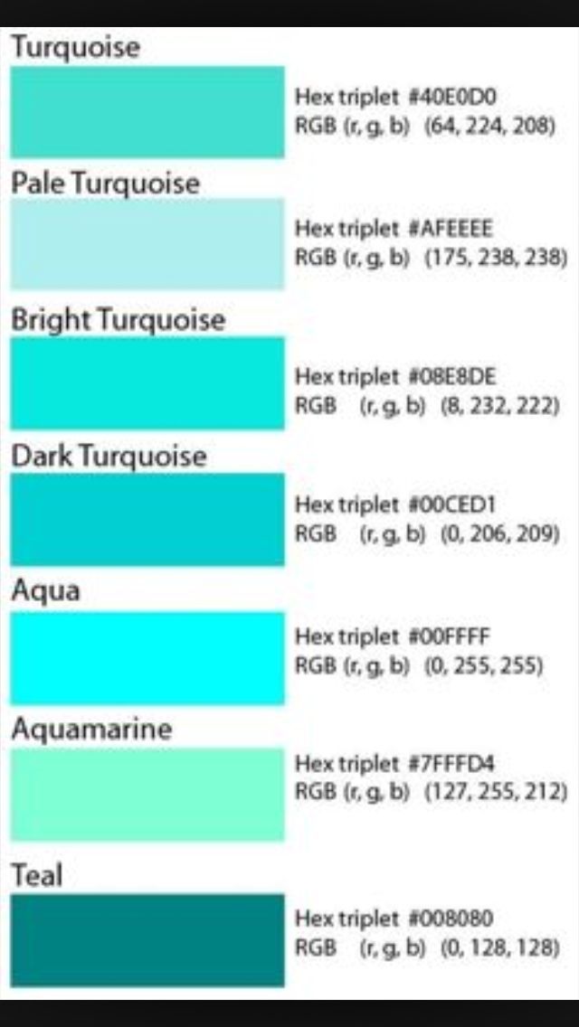 Однако пропорции синего и зеленого в этих цветах различаются. В зависимости от цветовой композиции RGB, бирюзовый также может иногда казаться мятно-бирюзовым и бирюзово-голубым. Все эти цвета различаются своими шестнадцатеричными кодами, цветовой композицией RGB, цветовой композицией CMYK, углом оттенка, насыщенностью цвета и яркостью цвета.