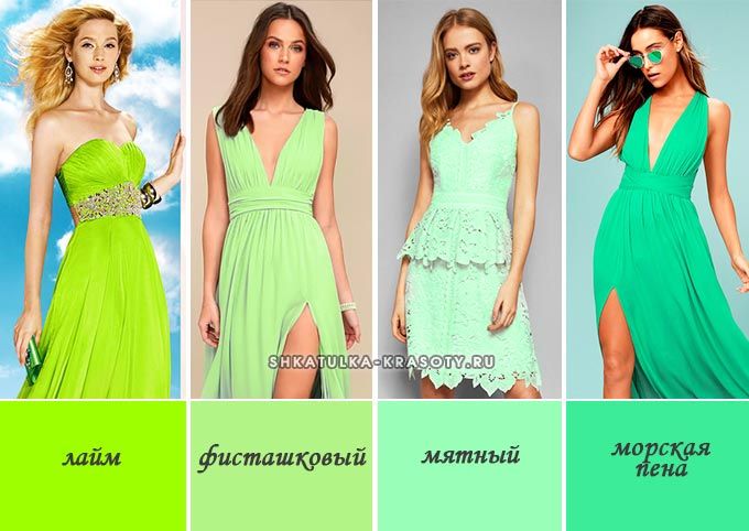 Чистый насыщенно-зелёный оттенок допустимо соединять с мятным или бирюзовым именно по принципу градиента или мелкого включения, иначе они смотрятся вместе не слишком гармонично.Мятные и бирюзовые ткани рекомендуется сочетать в одежде с такими цветами, как: