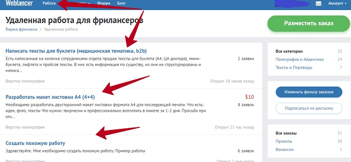 Через многие биржи фриланса можно найти как удаленную работу (смотрите раздел «вакансии»), так и заказы для фрилансеров по разным направлениям и это отличный вариант дохода через интернет.