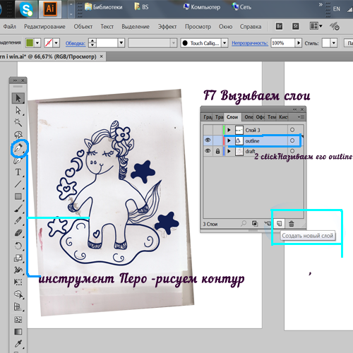 Я думаю, нам проще будет поработать с готовой иллюстрацией, на которой четко видны линии контура. Я отсканировал детскую книжку раскраску и поместил ее в документ (File > Place…)