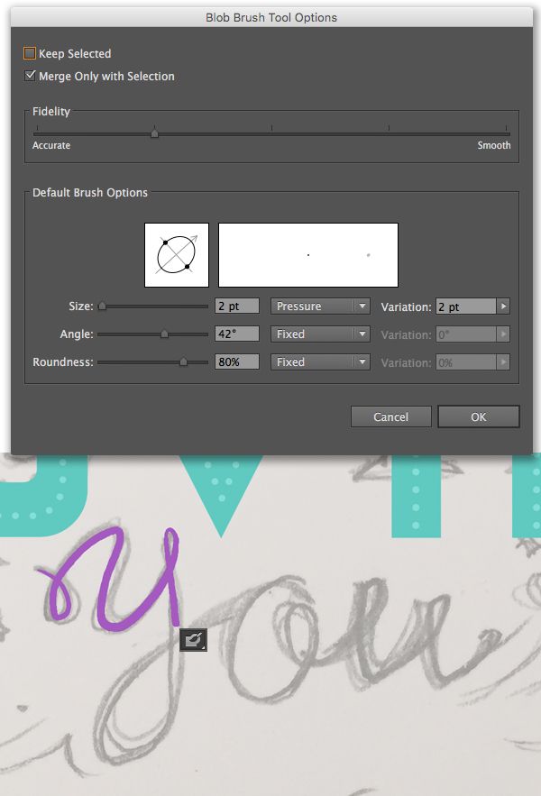 Если включено только слияние, объединяются все штрихи. Вы всегда можете использовать панель поиска пути, чтобы объединить векторные пути. Верность обеспечивает большую точность, но добавляет больше очков. Гладкость менее точна, но меньше точек. Установите размер, это может быть тонкая линия или большой жирный штрих. Установите округлость менее 100%, чтобы создать эллиптическую обводку, более похожую на каллиграфическую обводку. При округлости менее 100% вы также можете наклонить обводку.