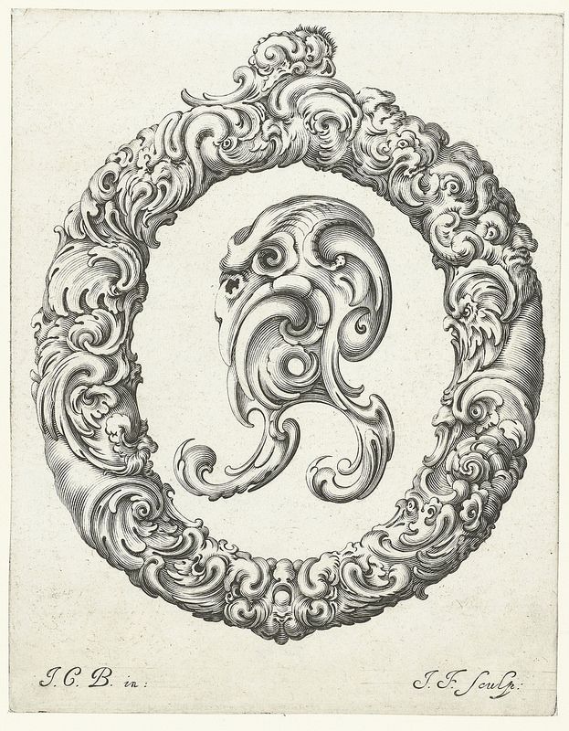 Причудливые фантазии, выложенные из обломков раковин (фр. rocaille), — основной мотив нового стиля, лёгший в основу его названия (rococo = rocaille + barocco). Французские орнаментальные инициалы XVIII века.