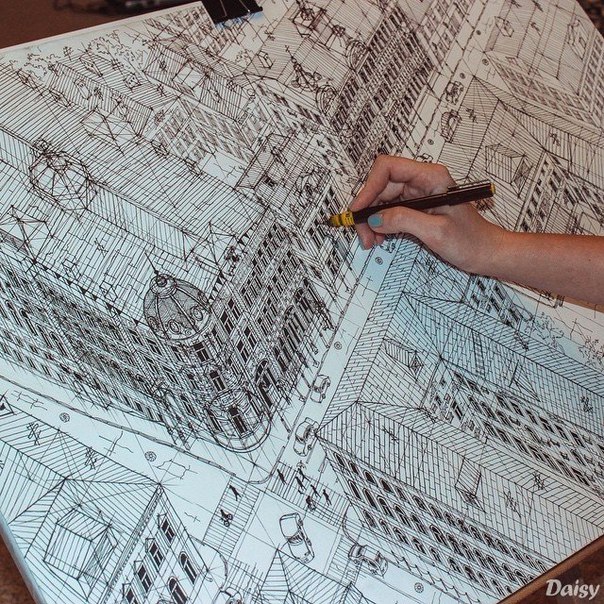 В отличие от настоящих художников я не предъявляю особых требований к материалам. В качестве носителя информации могу взять обычную офисную бумагу любой плотности, и даже самую дешевую. Использую обычные графитовые карандаши — твердые и мягкие, ручку с черными чернилами. Еще у меня есть дизайнерские двусторонние маркеры, в основном серые, черные и желтые. Желтым цветом я подчеркиваю детали.