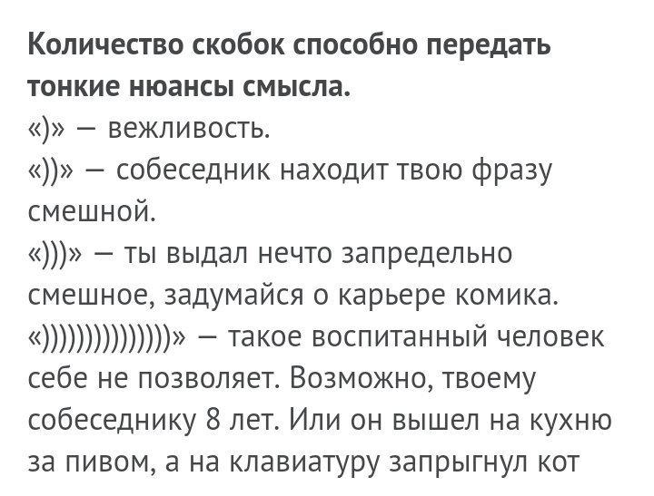 Скобочки в переписках обозначают степень улыбки пользователя, который их отправляет. То есть одна скобочка это просто «доволен», две чуть больше «доволен», три уже смех и далее подразумевается, что пользователь очень сильно смеётся, но обычно, всё это не работает и скобки ставят просто по привычке.