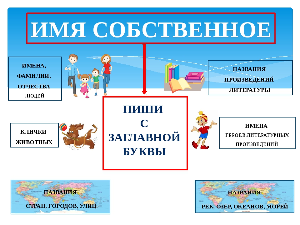 1. Имена собственные: имя и фамилия человека, кличка животного, прозвище, псевдоним, географические названия (названия любых населенных пунктов, городов, стран, рек, морей, океанов, озер, улиц, площадей), названия фирм, общественных организаций, музеев, художественных произведений.