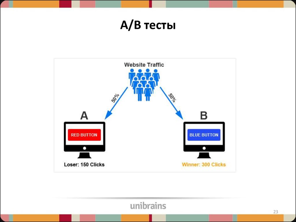 ΠΎΠ΄Π½ΠΎΠ³ΠΎ Π²Π΅Π±-ΡΠ»Π΅ΠΌΠ΅Π½ΡΠ° (Π΅ΡΠ΅ Π΅Π³ΠΎ Π½Π°Π·ΡΠ²Π°ΡΡ ΠΊΠΎΠ½ΡΡΠΎΠ»ΡΠ½ΠΎΠΉ Π³ΡΡΠΏΠΏΠΎΠΉ ΠΈΠ»ΠΈ ΡΠΎΡΠΊΠΎΠΉ ΠΎΡΡΡΠ΅ΡΠ°) . ΠΠ°Π»Π΅Π΅, ΠΌΡ Π΄Π΅Π»ΠΈΠΌ ΡΡΠ°ΡΠΈΠΊ ΠΏΠΎΠΏΠΎΠ»Π°ΠΌ (Π² ΡΠ»ΡΡΠ°ΠΉΠ½ΠΎΠΌ ΠΏΠΎΡΡΠ΄ΠΊΠ΅: ΡΠΎ Π΅ΡΡΡ ΡΠ°ΡΠΏΡΠ΅Π΄Π΅Π»ΡΠ΅ΠΌ ΠΏΠΎΠ»ΡΠ·ΠΎΠ²Π°ΡΠ΅Π»Π΅ΠΉ ΡΠΎΠ³Π»Π°ΡΠ½ΠΎ Π½Π΅ΠΊΠΎΠΉ Π²Π΅ΡΠΎΡΡΠ½ΠΎΡΡΠΈ) , ΠΈ, Π½Π°ΠΊΠΎΠ½Π΅Ρ, ΡΠΎΠ±ΠΈΡΠ°Π΅ΠΌ Π΄Π°Π½Π½ΡΠ΅ (ΠΌΠ΅ΡΡΠΈΠΊΠΈ) ΠΎ ΡΠΎΠΌ, ΠΊΠ°ΠΊ ΡΠ°Π±ΠΎΡΠ°Π΅Ρ ΠΊΠ°ΠΆΠ΄Π°Ρ Π²Π΅ΡΡΠΈΡ ΡΡΡΠ°Π½ΠΈΡΡ. Π‘ΠΏΡΡΡΡ ΠΊΠ°ΠΊΠΎΠ΅-ΡΠΎ Π²ΡΠ΅ΠΌΡ, ΠΌΡ Π°Π½Π°Π»ΠΈΠ·ΠΈΡΡΠ΅ΠΌ Π΄Π°Π½Π½ΡΠ΅ ΠΈ ΠΎΡΡΠ°Π²Π»ΡΠ΅ΠΌ ΡΡ Π²Π΅ΡΡΠΈΡ, ΠΊΠΎΡΠΎΡΠ°Ρ ΠΎΡΡΠ°Π±ΠΎΡΠ°Π»Π° Π»ΡΡΡΠ΅, Π° ΠΌΠ΅Π½Π΅Π΅ ΡΠ΄Π°ΡΠ½ΡΡ β Π²ΡΠΊΠ»ΡΡΠ°Π΅ΠΌ.