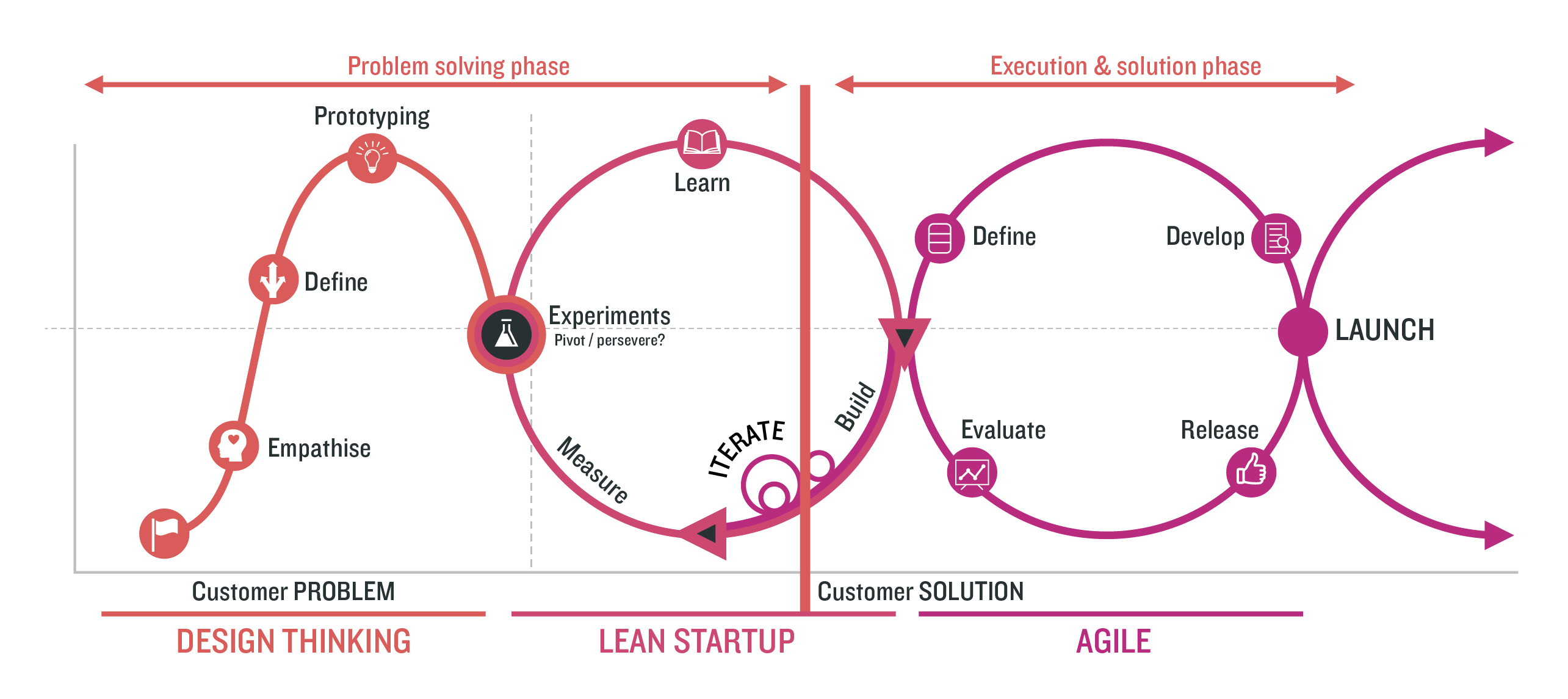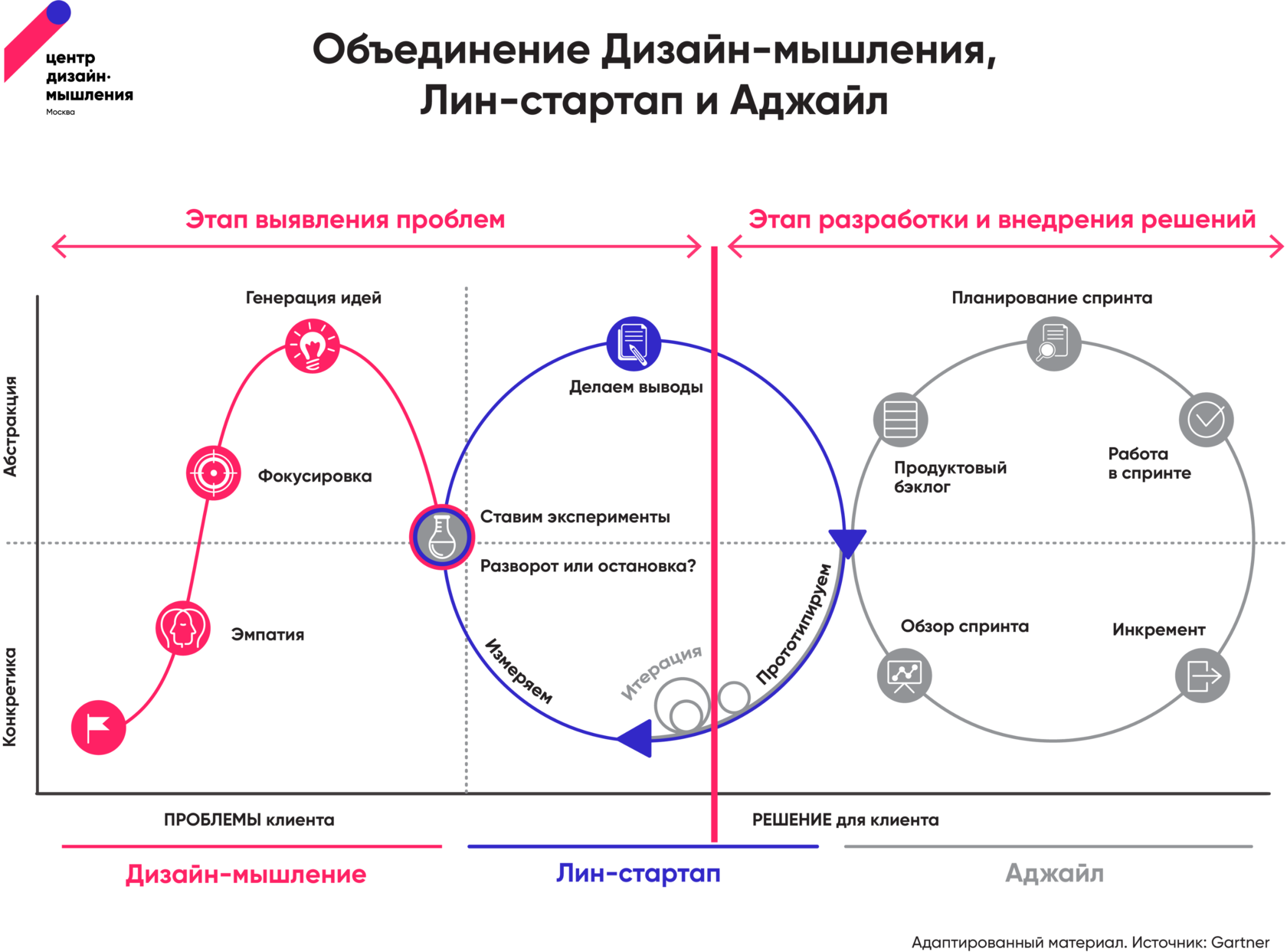 Π‘ΠΎΠ³Π»Π°ΡΠ½ΠΎ ΠΏΡΠ°ΠΊΡΠΈΠΊΠ΅ Π΄ΠΈΠ·Π°ΠΉΠ½Π° McKinsey, ΠΏΡΠΎΡΠ΅ΡΡ Π΄ΠΈΠ·Π°ΠΉΠ½-ΠΌΡΡΠ»Π΅Π½ΠΈΡ ΡΠΎΡΡΠΎΠΈΡ ΠΈΠ· Π΄Π²ΡΡ ΠΊΠ»ΡΡΠ΅Π²ΡΡ ΡΡΠ°ΠΏΠΎΠ²: