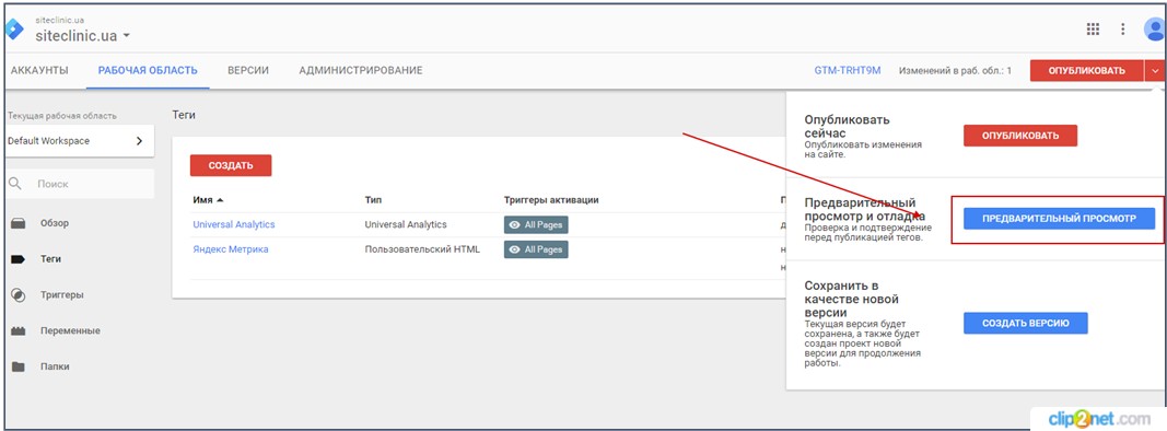 - В GTM есть режим проверки и отладки. Вы можете протестировать работу тегов прежде, чем добавлять их на сайт.
