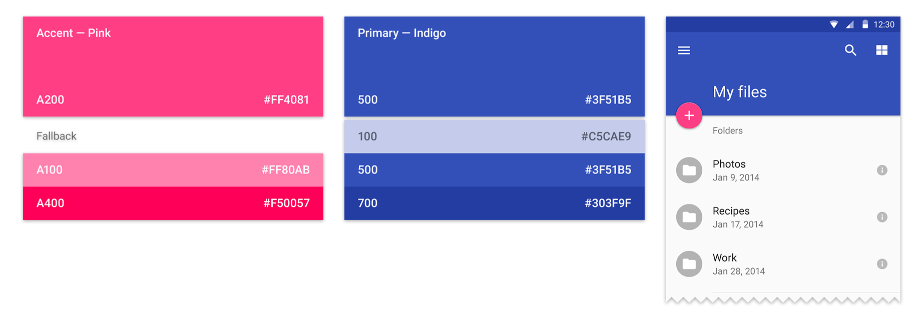 Пример цветовой системы для приложения, сайта или сервиса из «Официального руководства» по Material DesignFlat Design — это концепция «плоского» дизайна, при котором все элементы управления (иконки, кнопки, меню) лишены тени и визуального объема.