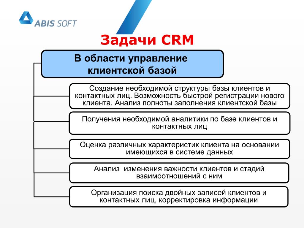Проведем более детальное сравнение возможностей CRM систем и ERP. К основным задачи CRM относятся: