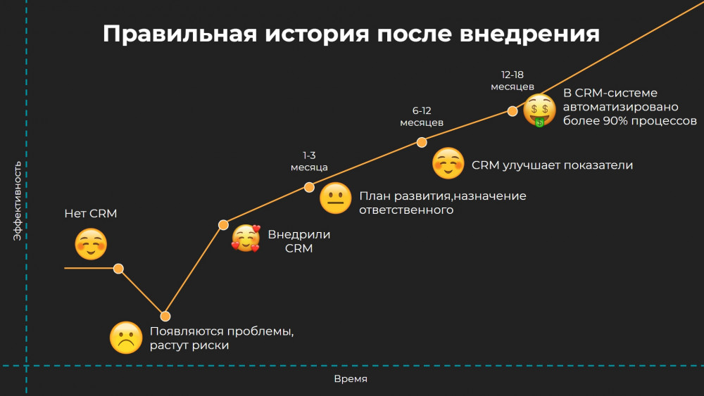 Вы тоже довольны. За два месяца работы с CRM удалось найти узкие места в воронке продаж и подкорректировать бизнес-процессы. Теперь каждая заявка обрабатывается быстрее, повторных продаж тоже стало больше, потому что CRM напоминает и об этом.