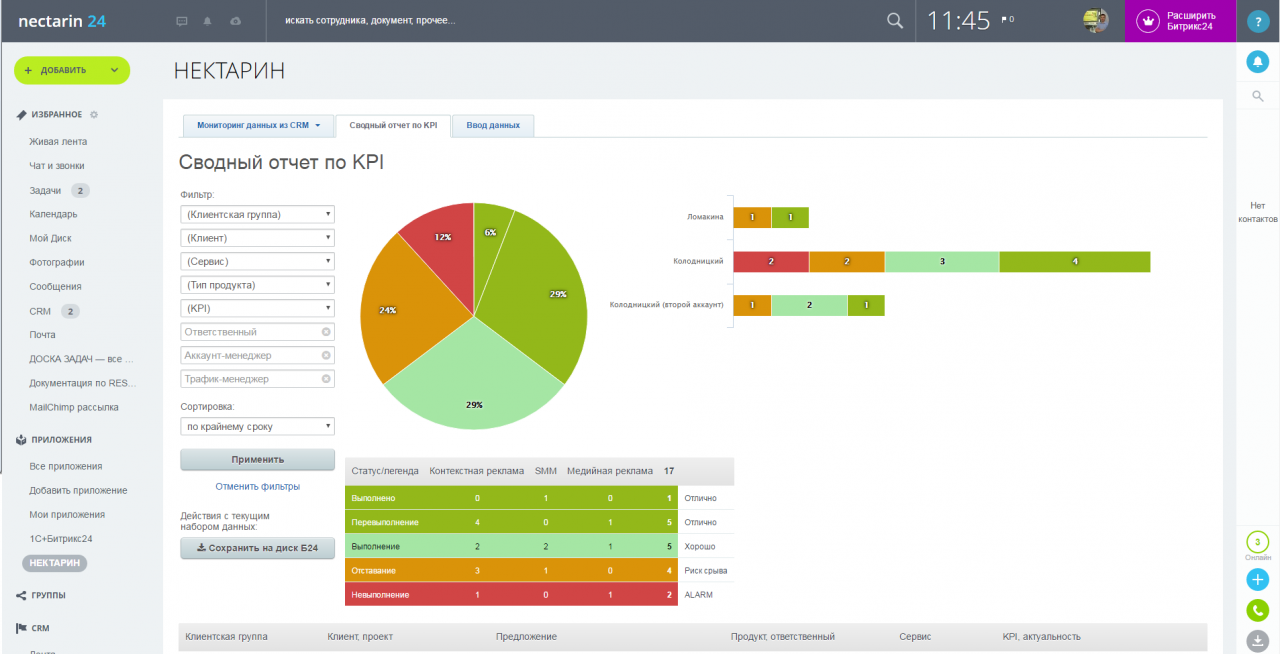 - Мониторинг активности сотрудников — система ведет учет рабочего время работников, позволяет распределять отпуска, выводит график отсутствия. С помощью CRM удобно контролировать работу каждого сотрудника, а также распределять задачи по мере занятости специалистов.