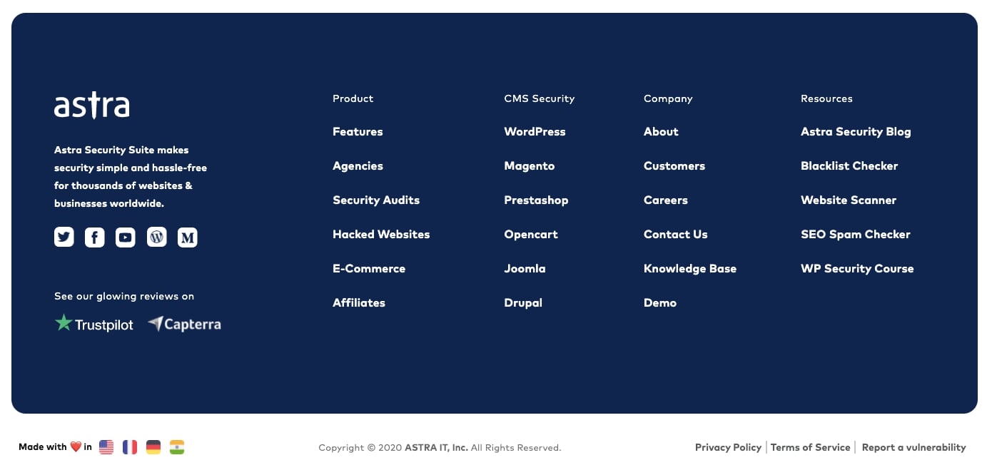 Все, что может помочь вашим посетителям, должно быть представлено в нижнем колонтитуле. Ожидается, что ссылки на справочные центры, часто задаваемые вопросы или поддержку будут находиться в нижнем колонтитуле веб-сайта.