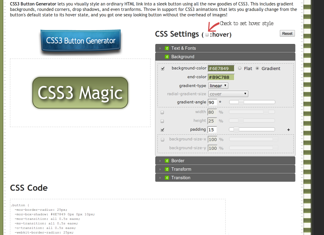 Один из самых лучших генераторов. Автором является Eric Hoffman. Есть возможность изменить и установить закругление, тень, градиент и прозрачность — самые часто используемые эффекты.