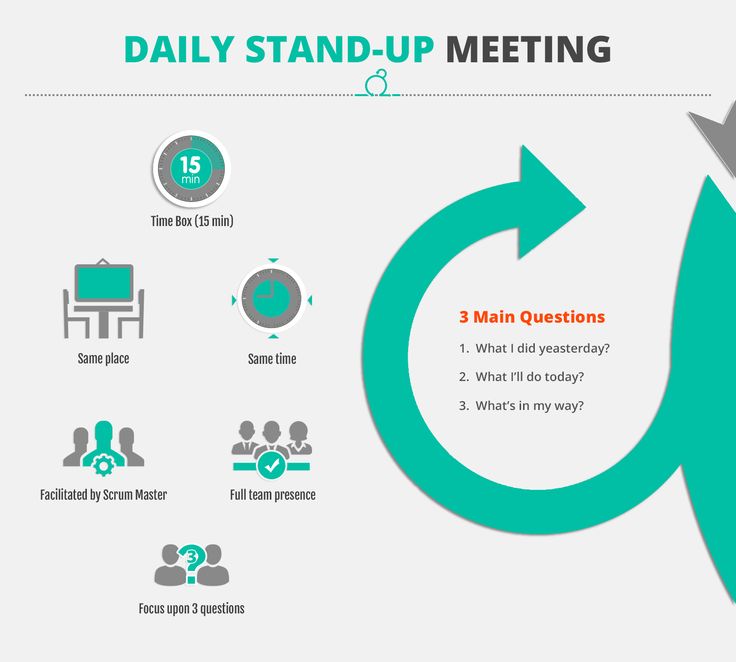 Продолжительность: не более 15 минут. Не бронируйте конференц-зал и не проводите stand up- ы сидя. Проводите стоя,что помогает сделать встречу короткой!