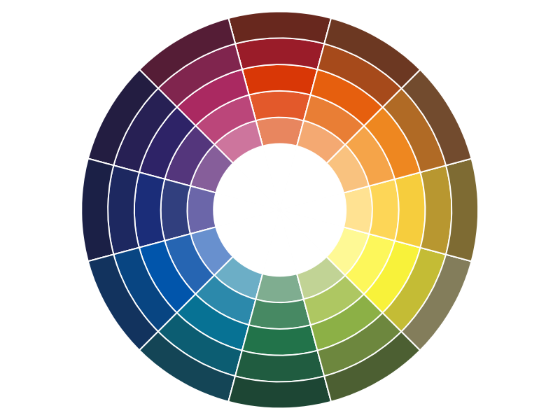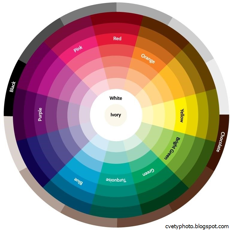 Цветовой круг это такая вот градация от жёлтого к жёлтому через все цвета радуги. Другими словами, это способ упорядочить все цвета.