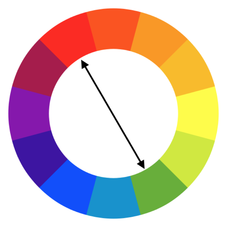 Так что же такое дополнительные цвета? Когда вы пытаетесь найти дополнительные цвета, возьмите цветовой круг и проведите линию от одного цвета прямо к противоположному.