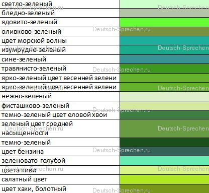 Аквамарин, бирюзовый, болотная зелень, бутылочный, вердепомповый, весенняя зелень, виридиан, груша, жёлтый шартрез, защитный, зелёный чай, изумрудный, красного моря, кислотный, лайм, лесная зелень, малахитовый, мирт, морская зелень, мох, мусульманский, нефритовый, оливковый, охотничий, персидский зелёный, салатовый, серая спаржа, сосна, трилистник, травяной фельдграу, фисташковый,