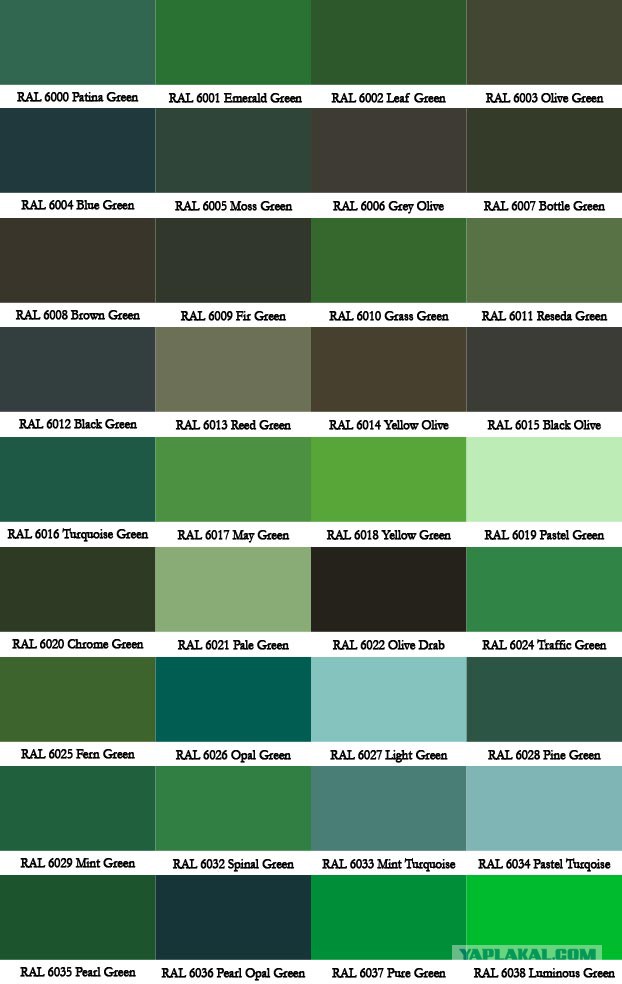 Вот какую линейку выдает яндекс. Я не стала сюда впихивать такие названия как очень темный, очень светлый, глубокий, умеренный, но их там множество.Аквамариновый Арлекин Индийский зелёный Зелёный Лесной зелёный Пигментный зелёный Изумрудный Пастельно-зелёный Миртовый Влюблённой жабы Лайм Зелёная лужайка Весенний бутон Вердепомовый Ирландский зелёный Малахитовый Нефритовый Кричащий зелёный Дартмутский зелёный Мичиганского университета Ёлки Мятно-зелёный Лиственно-зелёный Патиново-зелёный Зелёные джунгли Крайола Персидский зелёный Опаловый зелёный Сосновый зелёный Цвет Красного моря Фельдграу Хаки Шартрёз Трилистник Крайола Карибский зелёный Горный луг Бабушкины яблоки Селадон Зелёный лишайник Тёмное зелёное море Спаржа Крайола Спаржа Умеренный жёлто-зелёный Болотный Гусеница Фисташковый Июньский бутон Кленовый зелёный Майский зелёный Мокрый тропическийлес Зелёная сосна Бутылочно-зелёный Пихтовый зелёный