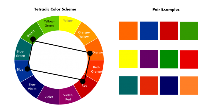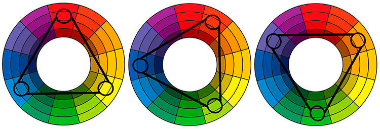 Сочетание 4 цветов, равноудаленных друг от друга на цветовом круге. Эти цвета отличаются друг от друга по тону, но также дополняют друг друга. Пример: фиолетовый, оранжево-красный, желтый, сине-зеленый.