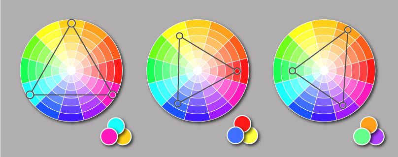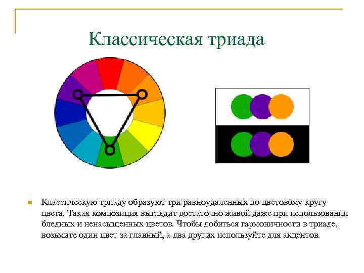 — При использовании любых трех цветов, равномерно распределенных по цветовому кругу, образуя треугольник.
