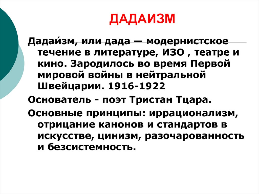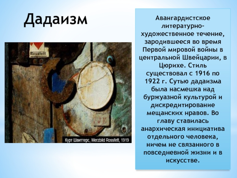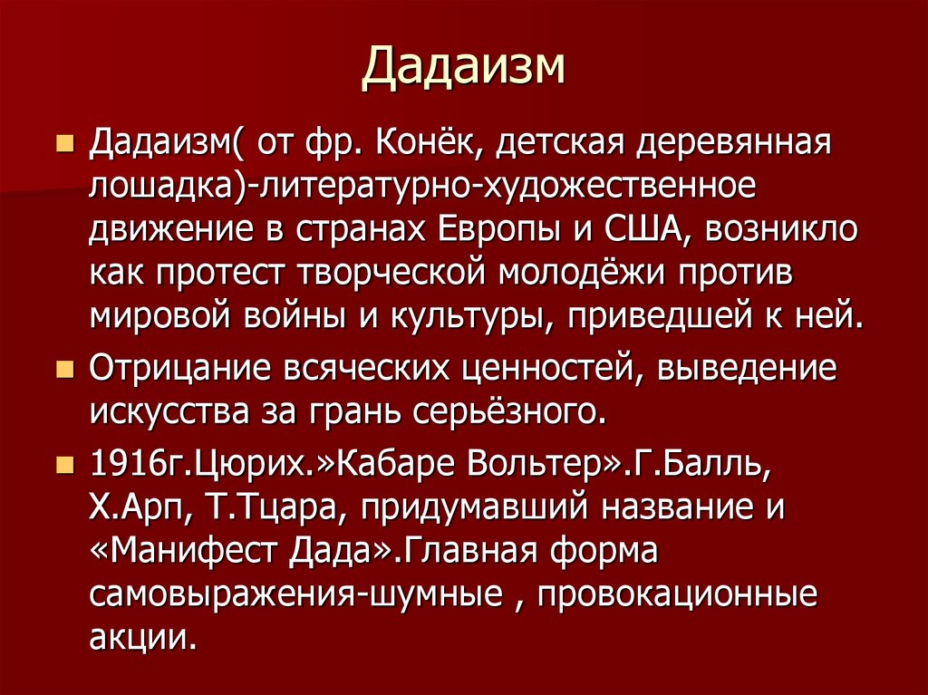 Дадаизм (дада) — авангардистское течение в литературе, изобразительном искусстве, театре и кино. Зародилось во время Первой мировой войны в нейтральной Швейцарии, в Цюрихе (Кабаре Вольтер). Существовало с 1916 по 1922 годы[1].