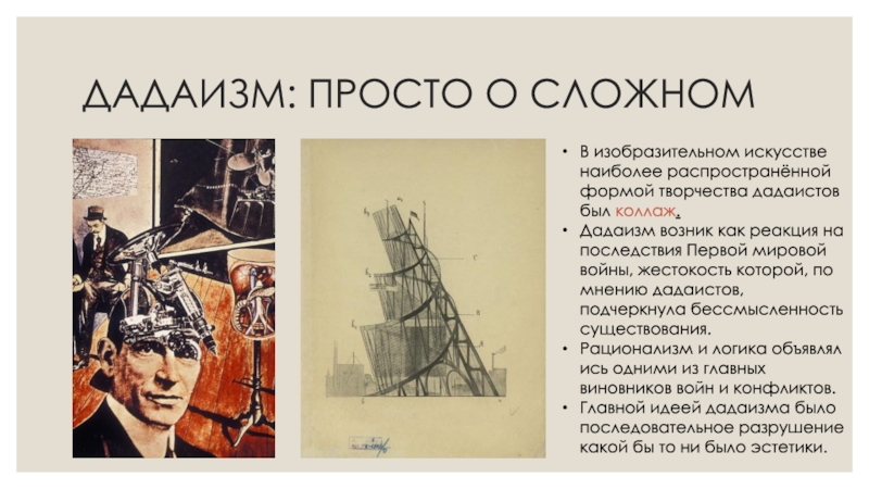 Дадаизм, или «дада» — стиль в искусстве в рамках авангарда, зародившийся в начале XX века в годы Первой мировой войны на территории Швейцарии — государства, сохранявшего нейтралитет и выглядевшего осколком утерянного мира на полыхающей карте Европы. Это авангардистское направление проникло в изобразительное искусство, литературу, театр и кинематограф. Дадаизм стал узнаваем.