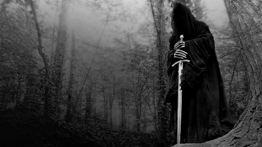 Женщина в костюме смерти вылезает из дыры в бумаге