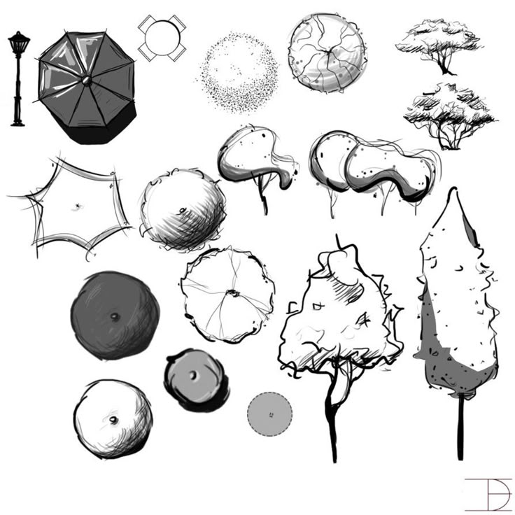 — $5.0054 Разнообразные деревья, созданные с помощью кистей Photoshop на фасаде (фасад) и в разрезе. Вы можете использовать их как силуэтные деревья или контурные деревья.