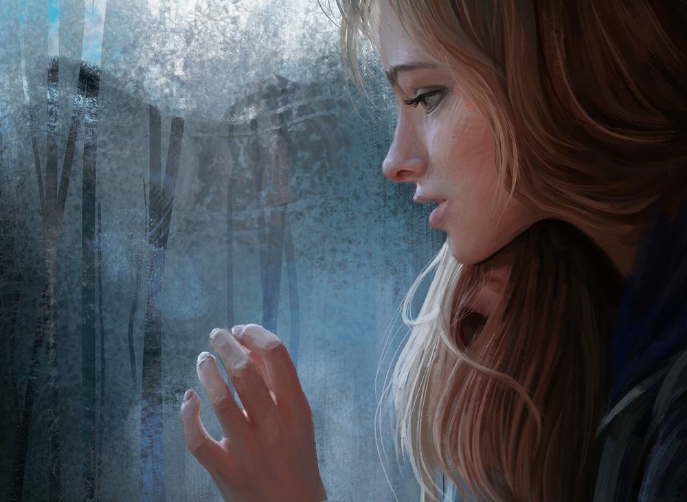 Мальчика, прислонившегося к окну второго этажа и смотрящего на окрестности в дождливый деньДобавить в набор