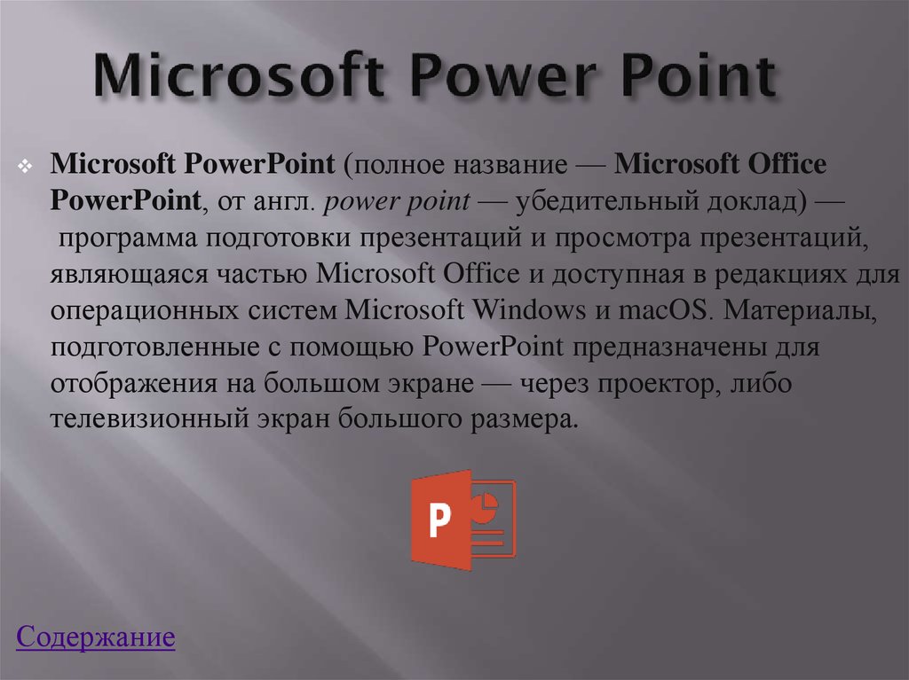- Microsoft PowerPoint — прога для подготовки/просмотра презентаций. Очень популярна.
