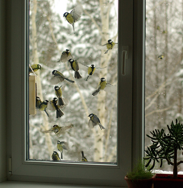 - из окна,